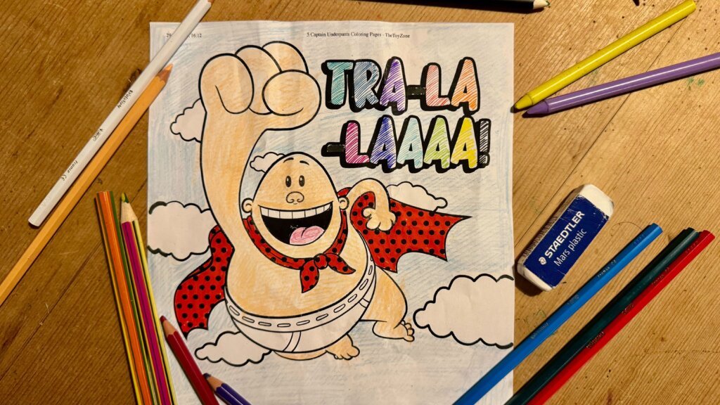 What is a better way to start this set of coloring pages than the person itself, the captain of the superhero, and his iconic call to Tra-la-laaa!